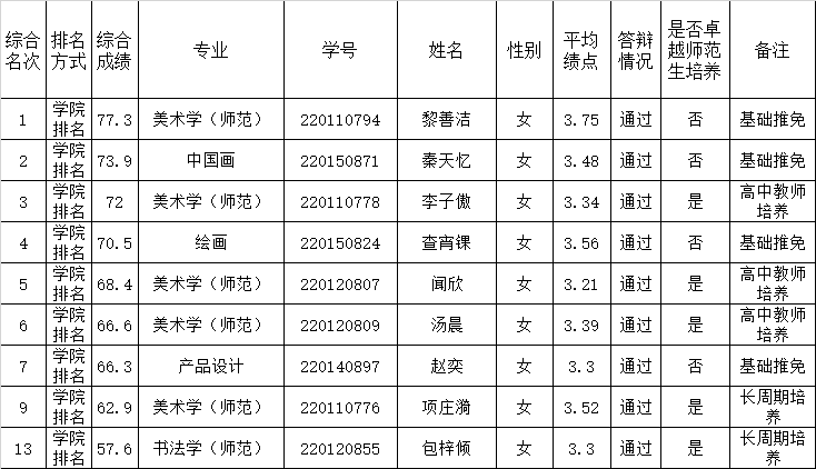 经学生报名,学院推荐工作小组进行资格审核,根据推免方案中学业综合成绩、个人社会贡献、学术专长三部分组成的推免生综合成绩排序,择优录取的原则,现将黎善洁等9名同学向学校推荐免试攻读研究生。名单如下: